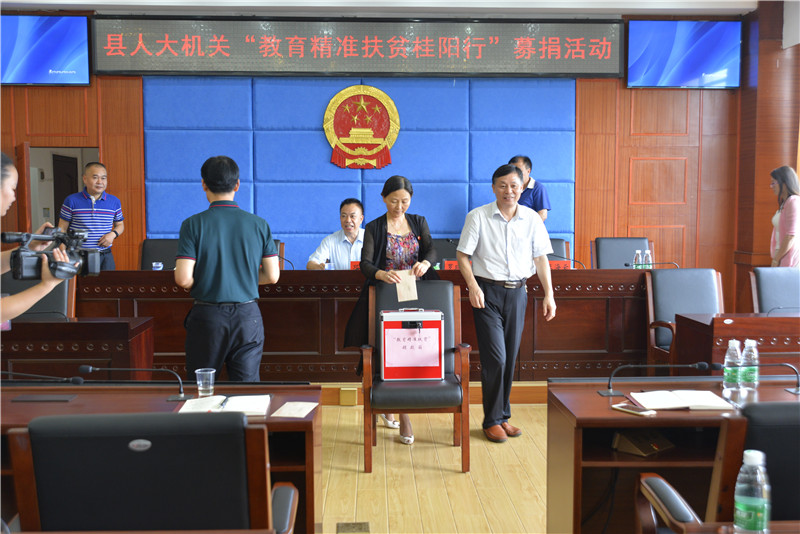 6月22日,县人大机关开展了“教育精准扶贫桂阳行”募捐活动。县人大常委会主任邓芳斌,副主任邓和平、谭宜通、罗晓文、黄爱军、李梅玉等带头募捐,募捐现场共收到善款8700元,所捐善款已转入桂阳县教育基金会账户,用于教育精准扶贫项目。