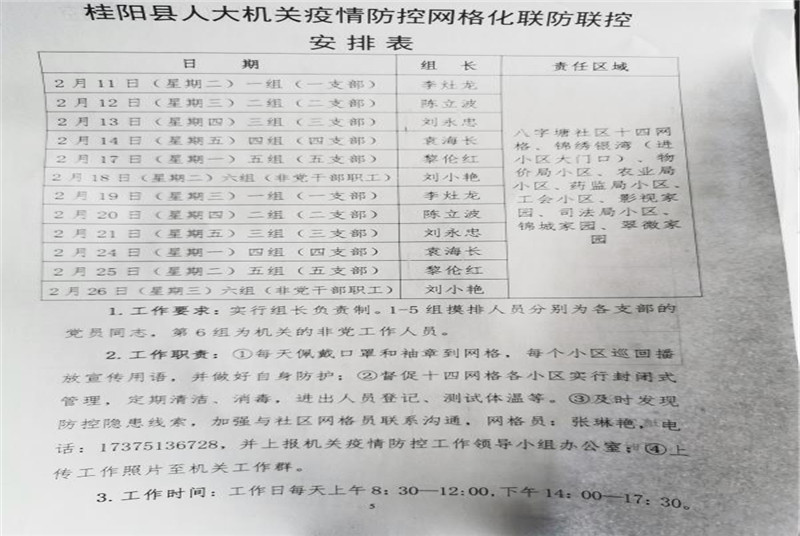 会上,组织学习了县委应急处置指挥部下发的《桂阳县新型冠状病毒感染的肺炎疫情“网格化”联防联控、群防群治工作方案》(桂疫指〔2020〕37号),通报了县疫情防控督查指出的问题,成立了人大机关联防联控、群防群治工作领导小组,研究并通过了相应工作方案。