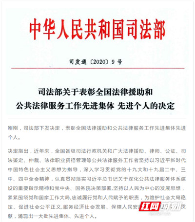 日前,司法部下发《关于表彰全国法律援助和公共法律服务工作先进集体先进个人的决定》(司发通〔2020〕9号),桂阳县法律援助中心被授予“全国法律援助先进集体”,这是县法律援助中心继2019年被省司法厅表彰为“刑事案件质量评查先进单位”后获得的又一殊荣。