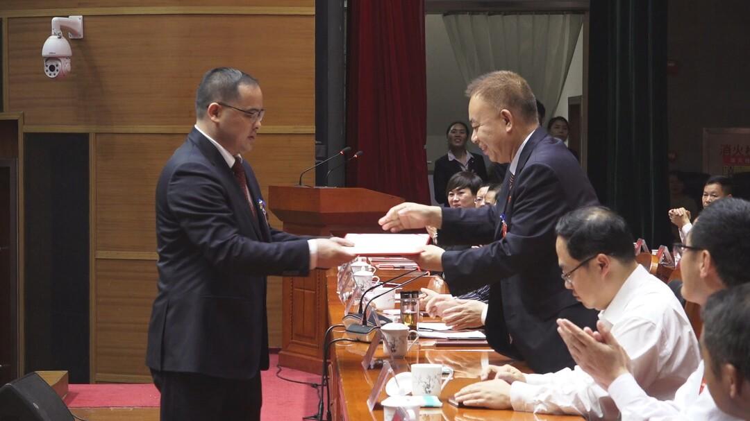 县人大常委会党组书记、主任邓芳斌向李志强同志颁发县人民政府县长当选证书。